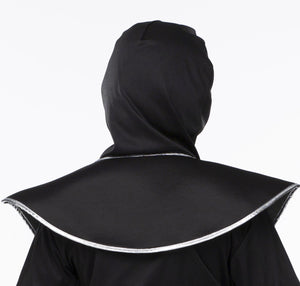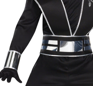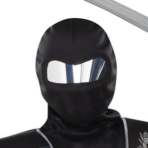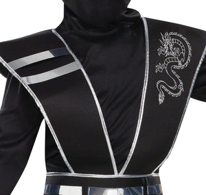 Fun World Mirror Ninja Silver Costume, Medium 8-10, Multicolor Top pants tunic with belt ankle guards wrist guards hood with mirror mask gloves Wrist & ankle bands are foam-backed foil & fasten w/ Hook and Loop fastener strips Tabard goes over the head & has self-fabric ties at waist, printed dragon on one shoulder Long-sleeved pullover shirt, elastic-waist pants, short gloves