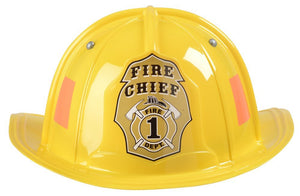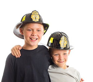 Aeromax Black Fire Chief HelmetDURABLE AND QUALITY construction to last for hours and hours of play.INCLUDES one plastic helmet with D-ring for hanging or clipping to a firefighter suit/costume.DETAILED with bright safety markings around outside and gold color fire chief emblem on frontCOMFORTABLE with fully adjustable youth sized headband. Makes for a quality fit for any young firefighter enthusiast.INTENDED for girls and boys ages 3 and up. EASY TO CLEAN inside and out! This item has been tested to meet USA safety standards for children's products.
