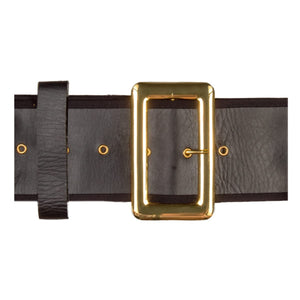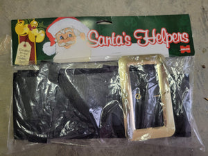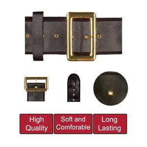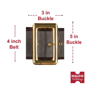 Deluxe bound wide vinyl belt has a large golden metal buckle with prong. Holes down the center of the belt have 6 fixed metal grommets to reduce wear from the metal prong. Binding along all the belt's edges help protect against fraying, ensuring a long-lasting life. Essential accessory for every Santa outfit! Made from vinyl material with gilt metal buckle with Prong Buckle measures 5" x 3 Large fits waist sizes 48-56