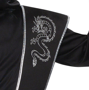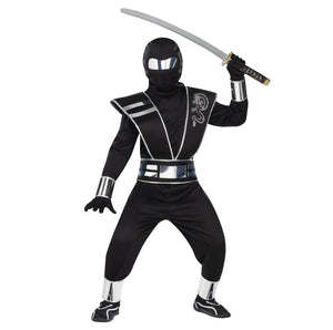Fun World Mirror Ninja Silver Costume, Medium 8-10, Multicolor Top pants tunic with belt ankle guards wrist guards hood with mirror mask gloves Wrist & ankle bands are foam-backed foil & fasten w/ Hook and Loop fastener strips Tabard goes over the head & has self-fabric ties at waist, printed dragon on one shoulder Long-sleeved pullover shirt, elastic-waist pants, short gloves