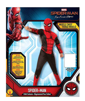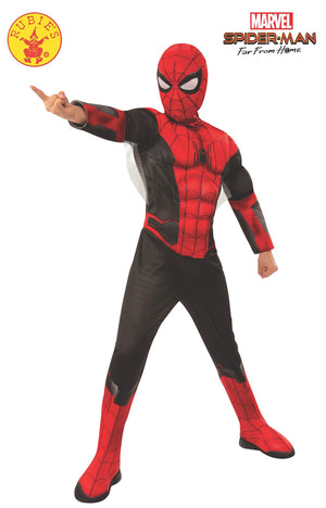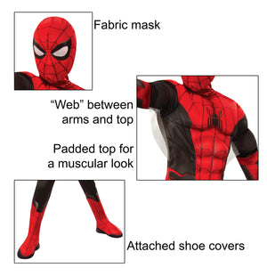 Rubies Marvel Spider-Man Far from Home Deluxe Spider-Man Costume & Mask, Small Red/Black Child's deluxe Red and black Spider-Man padded costume jumpsuit with attached boot-tops, and fabric mask Important! costumes are sized differently than apparel, use the Rubies child size chart, do not select size based on age or clothing size Officially licensed Marvel costume, look for trademark on label and packaging to help assure you've received authentic safety-tested item Groups/ families: create your own Spider-Man look with costumes from all your favorite movies From movie premieres to fan conventions and fun runs to Halloween, whatever the reason, or the season, Rubies, the world's largest designer and manufacturer of costumes and accessories, is pleased to offer you and your family the latest and most innovative concepts in masquerade