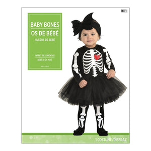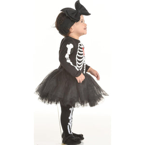 Amscan Adorable Skeleton Baby Tutu Dress Costume Set - (6-12 Months) 1 Set Black & White, Spooky Outfit for Your Little One's First Halloween No bones about it, your littlest one will be the most adorable in the room in our Baby Bones Halloween Costume featuring a small funky skeleton ribcage with a red heart on its left side Includes 1 skeleton bodysuit with an attached black tutu, a headband with a big black bow and velcro closure, plus matching skeletal tights for a mighty good look This costume fits infants from 6-12 months and provides a comfortable fit for your kid to prance around all day and night This is the perfect costume for Halloween parties or dress-up days at school; Pair with other skeleton outfits (not included) for group cosplay fun To care, remove accessories and then hand wash cold with like colors; Made from 100% polyester
