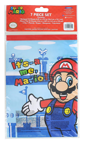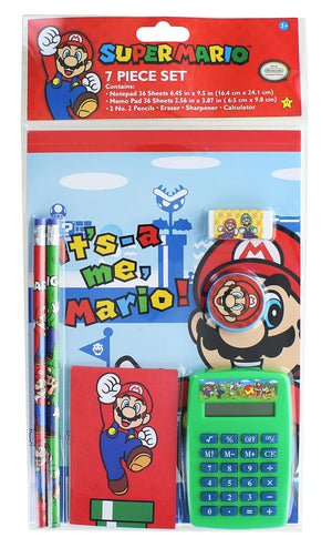 Mario Bros. Calculator School Supplies Set - 7 Piece Bundle for Back to School. TAKE SUPER MARIO TO SCHOOL - Let your child start the new school year with their favorite character at their side! Send themed school supplies and keep anxiety at bay. INCLUDES ALL THE TOOLS YOU NEED - This fun school supplies set includes a notepad (36 sheets, 6.45 x 9.5 inches, blank pages) and memo pad (36 sheets, 2.5 x 3.8 inches), 2 No. 2 pencils, an eraser, a pencil sharpener, and a calculator. BACK TO SCHOOL FUN - It's great for backpacks and desks for learning at home or kindergarten or elementary school. INCLUDES A KIDS’ CALCULATOR + PENCILS - The kid sized calculator has easy to press buttons and just the basic functions kids need. The set includes everything kids need for writing and math, all in one package! GET YOUR CHILD EXCITED FOR SCHOOL! Capture the smile as your child opens this bright Super Mario school supplies set and get ready for the countdown to the first day of school!